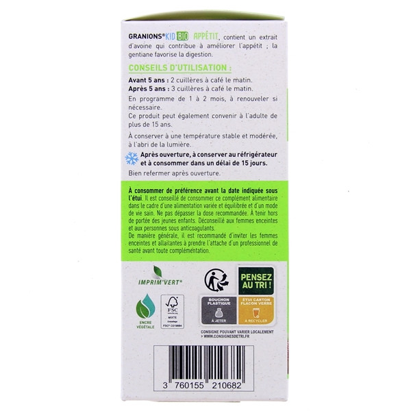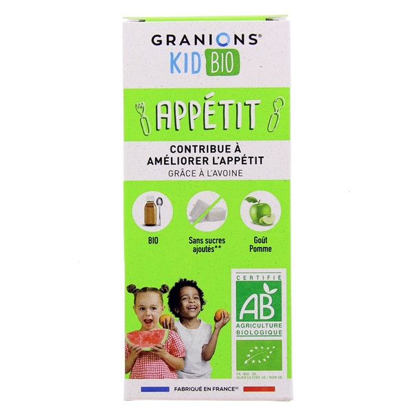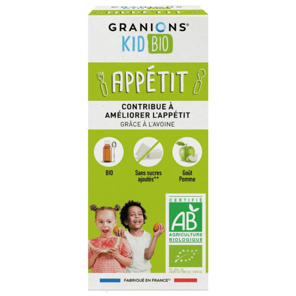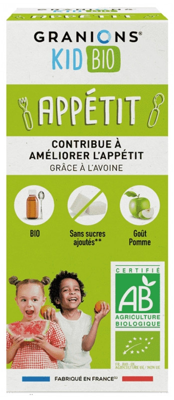 Le sirop pour enfant « appétit » est un complément alimentaire bio, au goût de pomme, spécialement élaboré par le laboratoire des Granions. Bénéficiant d'une formule riche en extraits d'avoine, ce complément alimentaire stimule efficacement l'appétit des jeunes enfants. Composé également des extraits de gingembre, de fenugrec et de gentiane d'origine biologique, le complément alimentaire Granions Appétit assure également le fonctionnement normal du système digestif. Ce complément alimentaire contient en outre, de la spiruline. Il ne renferme aucune trace de sucres ajoutés.
