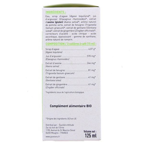 Eau, Sirop d'agave (Agave tequilana)*, Jus d'argousier (Elaegnus rhamnoïdes)*, Extrait d'avoine (Gluten) (Avena sativa)*, Arôme naturel de pomme verte, Extrait de fenugrec (Trigonella foenum-graecum)*, Extrait de gentiane (Gentiana lutea)*, Extrait de gingembre (Zingiber officinale)* ; Correcteurs d'acidité : Acide citrique, Acide ascorbique ; Épaississant : Gomme de xanthane, Arôme naturel de romarin.