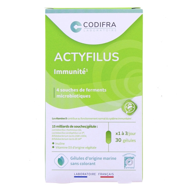 Actyfilus du laboratoire Codifra est constitué de de ferments lactiques, d'inuline de chicorée et de vitamine D. Il s'agit d'un complément nutritionnel qui permet de renforcer les défenses naturelles et de prendre soin de votre microbiote.