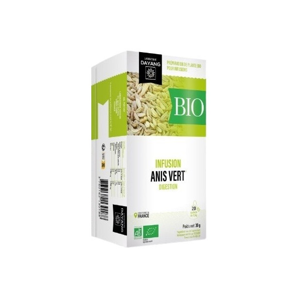 L'infusion bio anis vert de la marque Dayang est exclusivement composée de graines d'Anis vert, d'orgine 100 % biologique. Les actifs naturels qui composent les graines d'Anis vert soulagent efficacement les désagréments dus aux sensations de gonflement du ventre et aux flatulences. Ils agissent sur le système digestif en régularisant la production de gaz. L'infusion bio Anis vert de la marque Dayang se consomme tout au long de la journée, pour le confort du corps et le plaisir du goût.