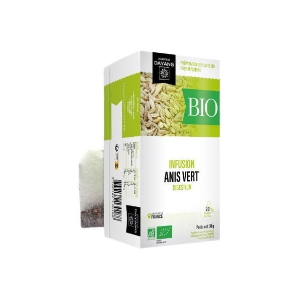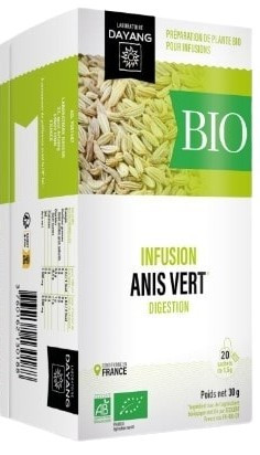Les graines d'Anis vert qui composent l'infusion bio Anis vert de la marque Dayang luttent quotidiennement contre les inconforts dus à la présence de flatulences ou de ballonnements.