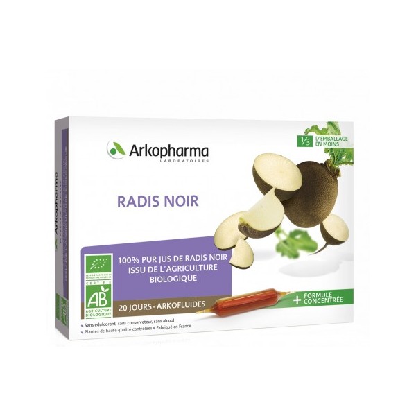 Arkofluides Radis noir Bio est un complément alimentaire développé par les laboratoires Arkopharma, formulé avec 100 % pur jus de Radis noir issu de l'agriculture biologique. Il est indiqué pour aider à purifier le foie, éliminer les toxines et améliorer la digestion.