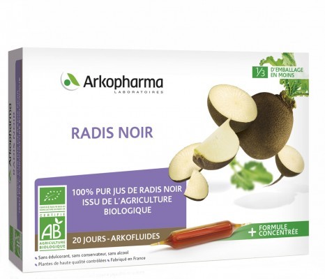 Les ampoules Arkofluides de Radis noir du laboratoire Arkopharma sont recommandées pour aider l'organisme à purifier le foie, améliorer le confort digestif et éliminer les toxines.
