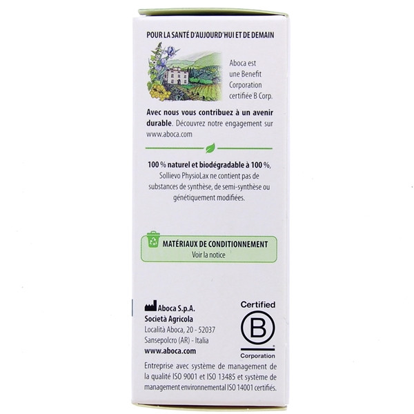 Sollievo PhysioLax est obtenu grâce à des processus de fabrication qui n’utilisent pas de solvants ou d’autres substances de synthèse chimique