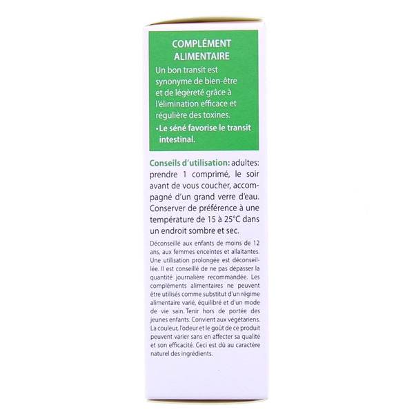 Agent de charge : Cellulose microcristalline, Fibres prébiotiques (FOS), Extraits secs de : Artichaut (Cynara scolymus L.), Fenouil (Foeniculum Vulgare Miller), Séné (Cassia angustifolia Vahl) ; Agents d'enrobage : Hydroxypropylmethylcellulose, Hydroxypropylcellulose ; Extrait sec de canéficier (Cassia fistula L.), Anti-agglomérants : Talc, Stéarate de magnésium.