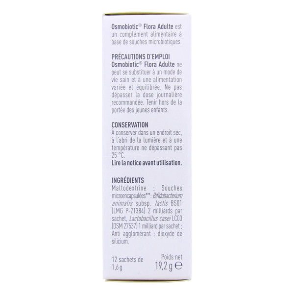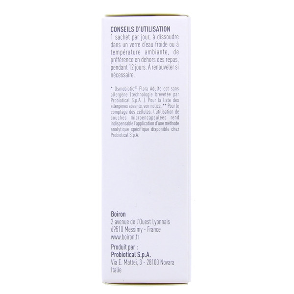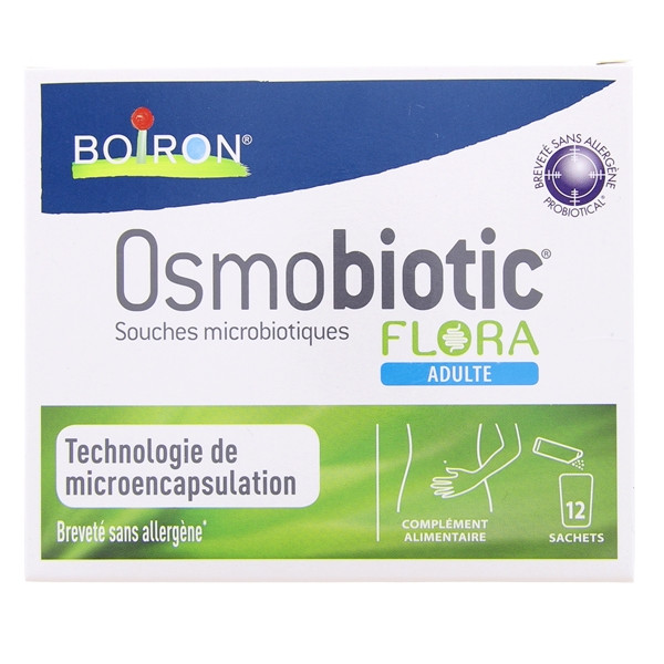 Osmobiotic Flora Adulte du laboratoire Boiron est un complément alimentaire contenant des souches microbiotiques. Il est recommandé pour le maintien de la flore intestinale.