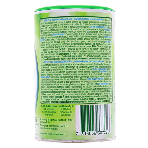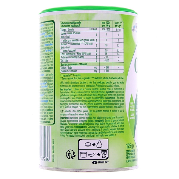 Le complément nutritionnel Optifibre est conditionné dans une boîte de 125 g ou 250 g. Il s'agit d'un complément alimentaire diététique qui est destiné à être utilisé à des fins médicales. Optifibre rééquilibre la flore intestinale tout en assurant une bonne consistance des selles. En effet, Optifibre va agir en même temps sur la constipation par la relance de la composition du microbiote intestinal. L'efficacité de ce complément alimentaire a été prouvée par les spécialistes et par des études cliniques. Ce complément alimentaire est dépourvu d'arômes. Par conséquent, il est tout à fait possible de le mélanger avec la plupart des aliments pris au quotidien. Il peut être utilisé sur une longue ou sur une courte durée en fonction des besoins.