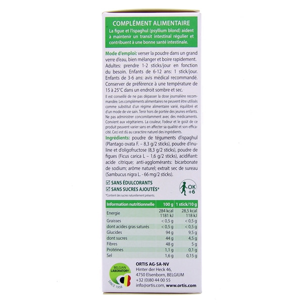 Poudre de téguments d’ispaghul (Plantago ovata F.—8,3 g/2 sticks), poudre d’inuline et d’oligofructose (8,3 g/2 sticks), poudre de figues (Ficus carira L. — 1,6 g/2 sticks), acidifiant : acide citrique ; anti-agglomérant : bicarbonate de sodium ; arôme naturel ; extrait sec de sureau (Sambucus nigra L. — 66 mg/2 sticks).