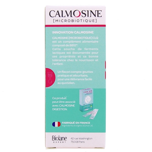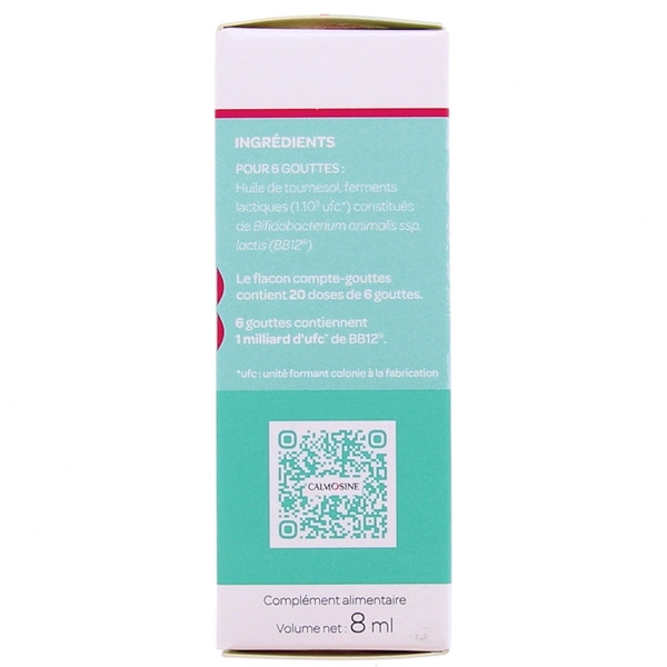 Dans 6 gouttes de Calmosine Microbiotique CLQ 8 ml, il y a de l’huile de tournesol et des ferments lactiques (1 109 unités formant une colonie) constitués de Bifidobacterium animalis ssp. lactis (BB12).