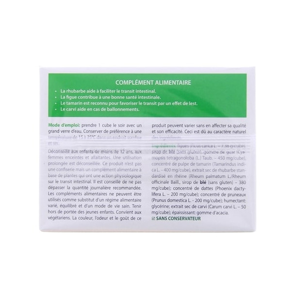 Figues (Ficus carica L.), Sirop de blé (sans gluten), Gomme de guar (Cyamopsis tetragonoloba (L.) Taub.), Concentré de pulpe de tamarin (Tamarindus indica L.), Extrait sec de rhubarbe standardisé en rhéine (Rheum palmatum L./Rheum officinale Baill., Sirop de blé (sans gluten) ; Concentré de dattes (Phoenix dactylifera L.) ; Concentré de pruneaux (Prunus domestica L.) ; Humectant : Glycérine ; Extrait sec de carvi (Carum carvi L.) ; Épaississant : Gomme d'acacia.