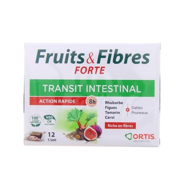 Fuirts & Fibres Forte Transit intestinal des laboratoires Ortis est recommandé en cas de paresse intestinale occasionnelle. Grâce à ses ingrédients Fruits & Fibres forte d'Ortis apporte une action rapide en 8 h sur le transit.