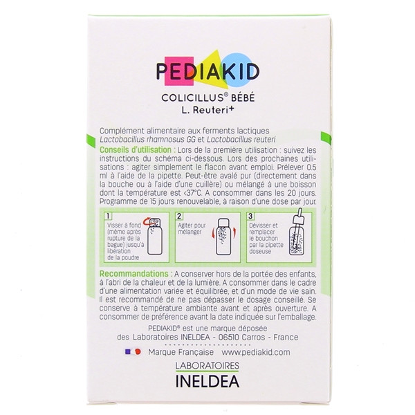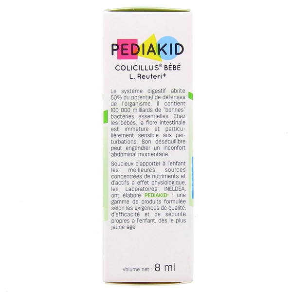 Fabriqué en France par les Laboratoires INELDEA, le complément alimentaire Pediakid colicillus L. Reuteri est présenté en flacon compte-goutte de 10 ml. Pediakid fait partie de la gamme des produits, formulée selon les exigences de qualité, d’efficacité et de sécurité propres à l’enfant.