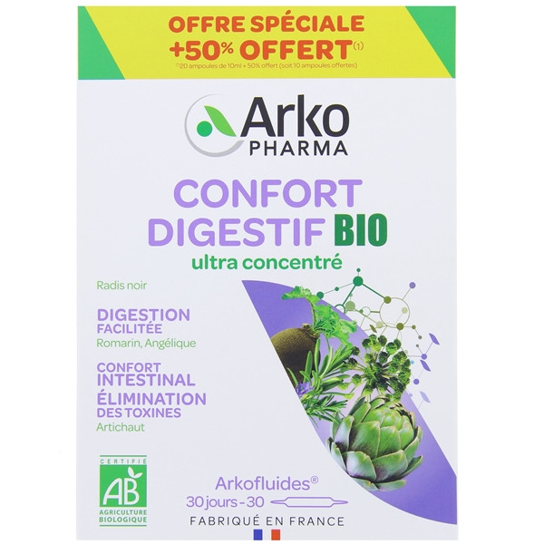 Le complément alimentaire Confort Digestion Bio Arkofluides permet de conserver le confort digestif. Avec une formule ultra concentrée, il contribue à faciliter la digestion, favoriser le confort intestinale et éliminer les toxines.