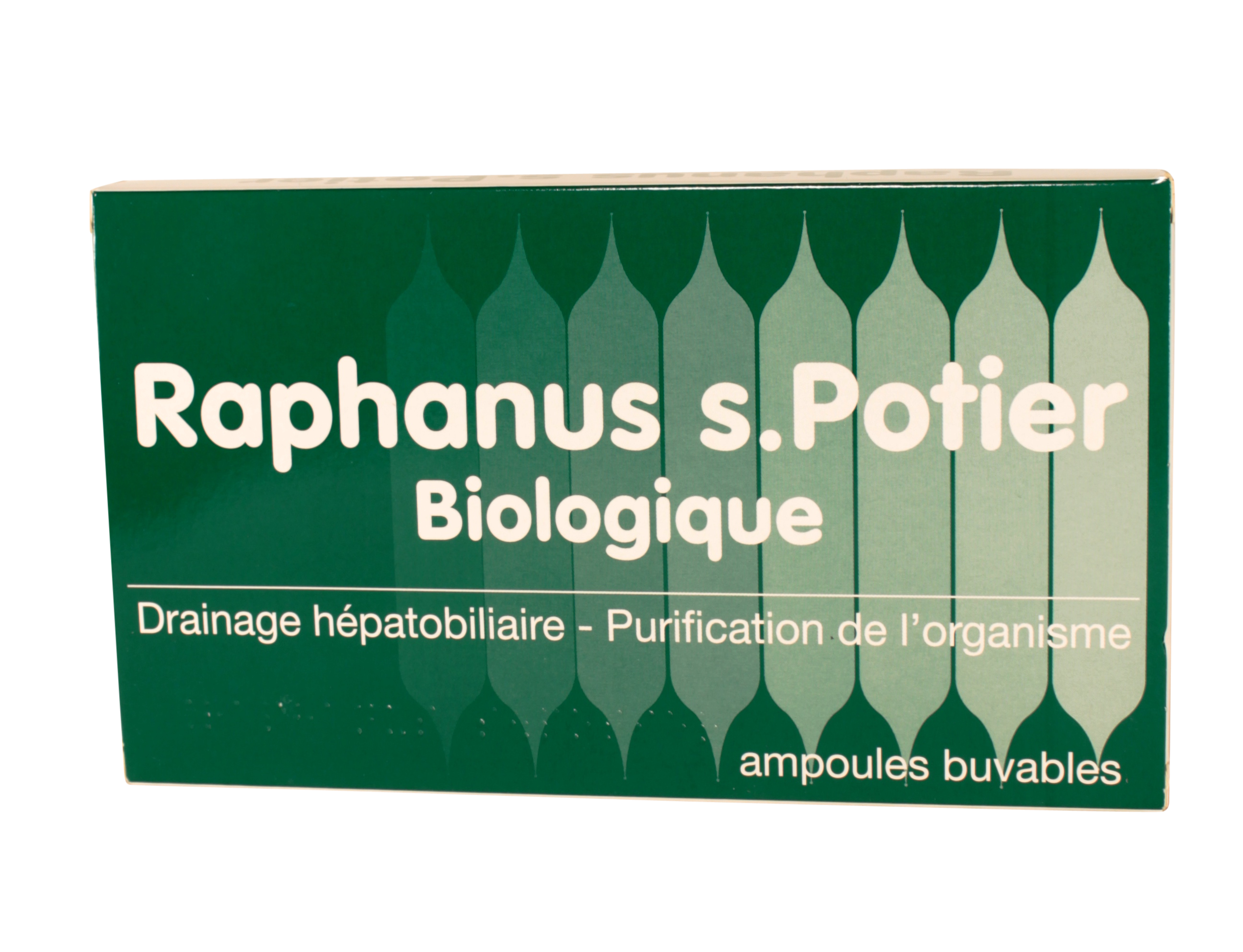 Le complément alimentaire Raphanus S. Potier Biologique est indiqué pour favoriser la purification et le drainage hépato-biliaire de l'organisme. Grâce au soufre apporté par le jus de radis noir, il agit efficacement sur les troubles gastriques en rétablissant une bonne circulation biliaire. Présenté en boite de 12 ampoules de 10 ml.