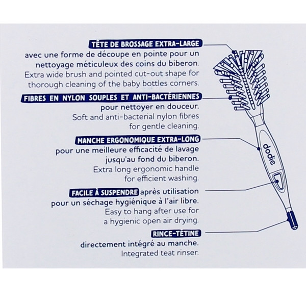 Développé par la marque Dodie, ce goupillon 2 en 1 sert essentiellement à simplifier le nettoyage des biberons à col large. En effet, il convient spécifiquement aux modèles « Initiation+ » et « Evolution+ » ainsi qu’aux tétines de la marque.