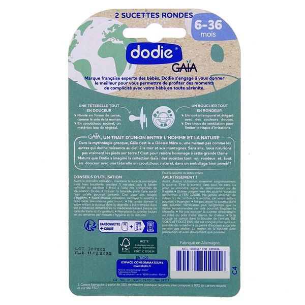 Une particularité de ces Sucettes Sous le Soleil de la marque Dodie est sa téterelle à bout rond qui imite la forme des bouts de seins de maman. Cela apporte une sensation naturelle qui favorisera le bien-être de votre tout-petit. La téterelle est fabriquée en caoutchouc qui est une matière végétale à la fois naturelle, douce et souple.