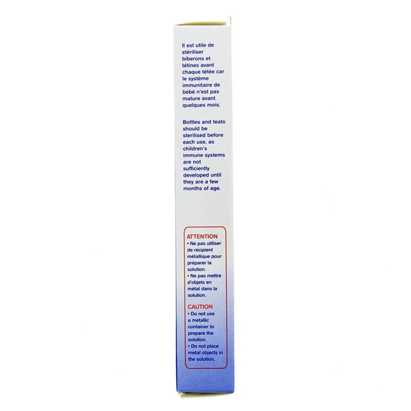 Pour stériliser biberons et tétines du bébé, il est conseillé de dissoudre les comprimés dans de l’eau froide. Vous dissolvez 1 comprimé dans 2.5 l d’eau pour stériliser 3 biberons et 3 tétines ou encore 2 comprimés dans 5 litres d’eau pour 6 biberons et 6 tétines. Vous laissez uniquement les tétines et les biberons immerger dans la solution pendant 30 mn.