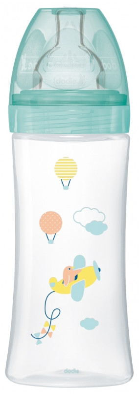 Le biberon anti-colique modèle Air de la marque Dodie a été conçu pour les bébés de 6 mois et plus. Il possède une tétine plate en silicone de débit 3 qui facilite le passage de la tétée du sein au biberon.