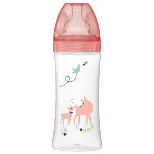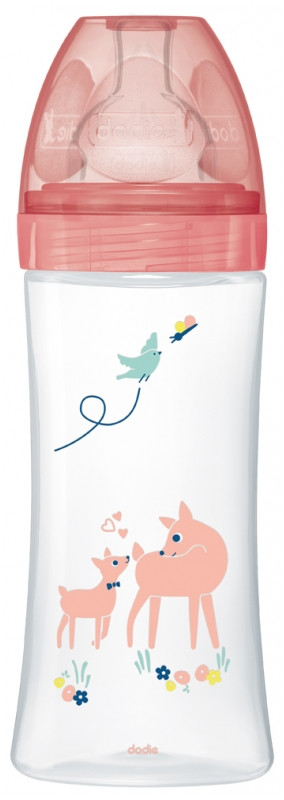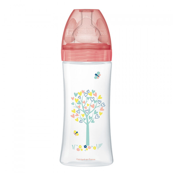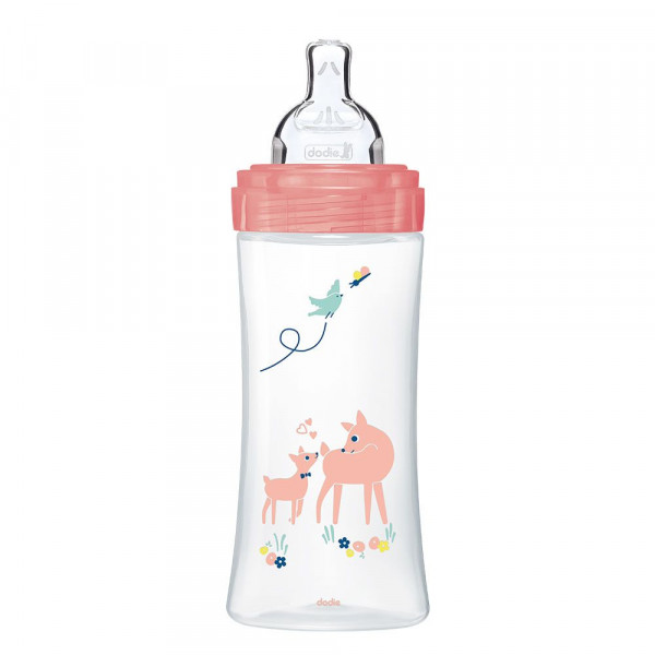 Le biberon anti-colique Tétine plate Débit 3 de 330ml de Dodie, avec motif jardin, est une solution pratique et sécuritaire pour nourrir bébé.