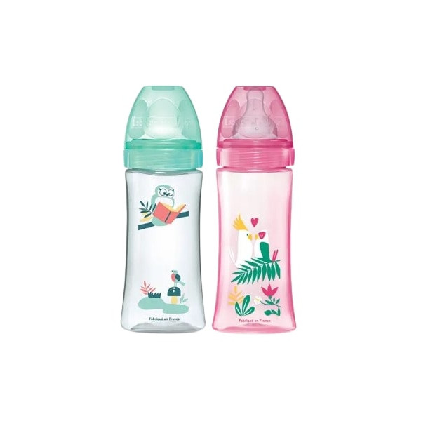 Disponible en lot de 2 biberons de 330 ml, motif Jungle rose et Forêt vert.