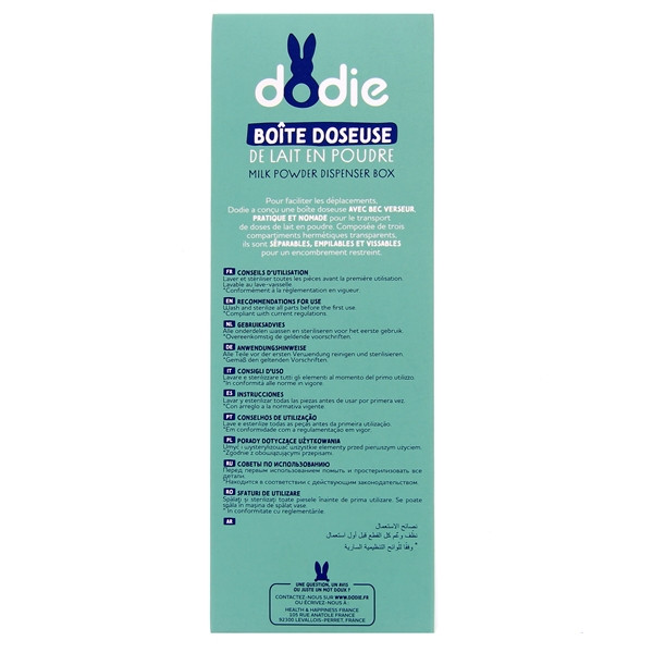 - Cette boîte doseuse Dodie est spécialement conçue pour stocker du lait en poudre ou encore des petits snacks de votre bébé. Évitez d’y ranger du lait maternisé mélangé avec de l’eau.