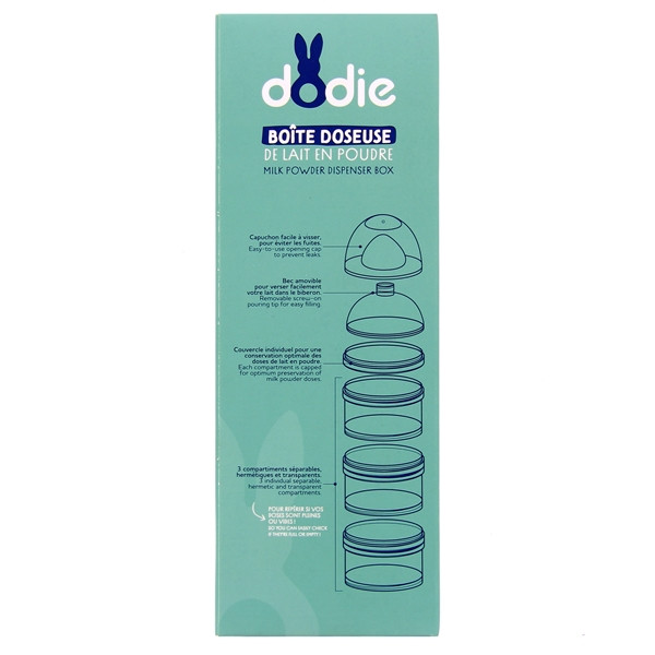 La boîte doseuse de la marque Dodie comporte 3 compartiments individuels pour que vous puissiez répartir les doses de lait en poudre dont votre bébé aura besoin. En plus de cela, cette boîte doseuse de lait en poudre est transparente pour que vous puissiez voir directement à travers.