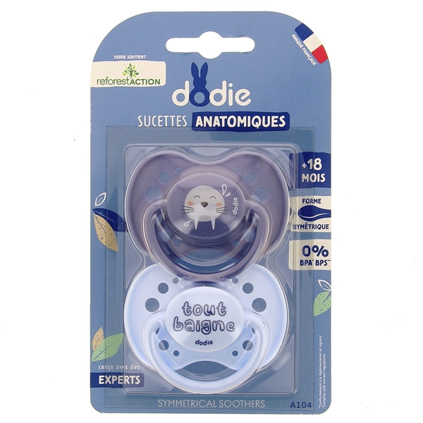 Les sucettes anatomiques édition limitée Reforest'action +18 mois de la marque Dodie se positionnent idéalement dans la bouche grâce à sa forme symétrique réversible. De plus, elles détiennent une téterelle nervurée en silicone qui résiste à l'arrivée des premières dents.
