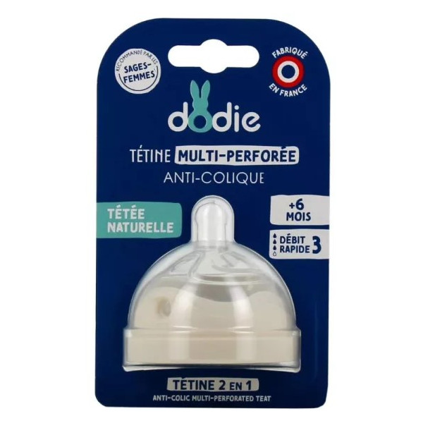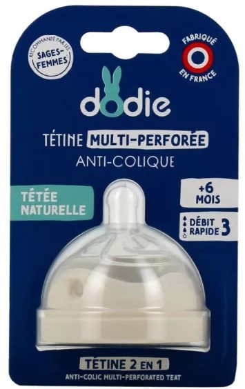 La Tétine Multi-Perforée Anti-Colique Débit 3 (rapide) 2 en 1 de la marque Dodie garantit une tétée naturelle et confortable pour bébé et un nettoyage facile et rapide pour les parents. Cette tétine s'utilise avec les biberons Dodie de cette même gamme.