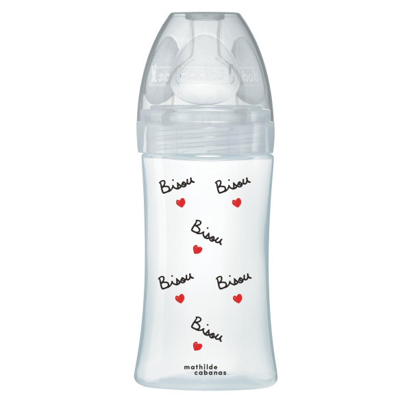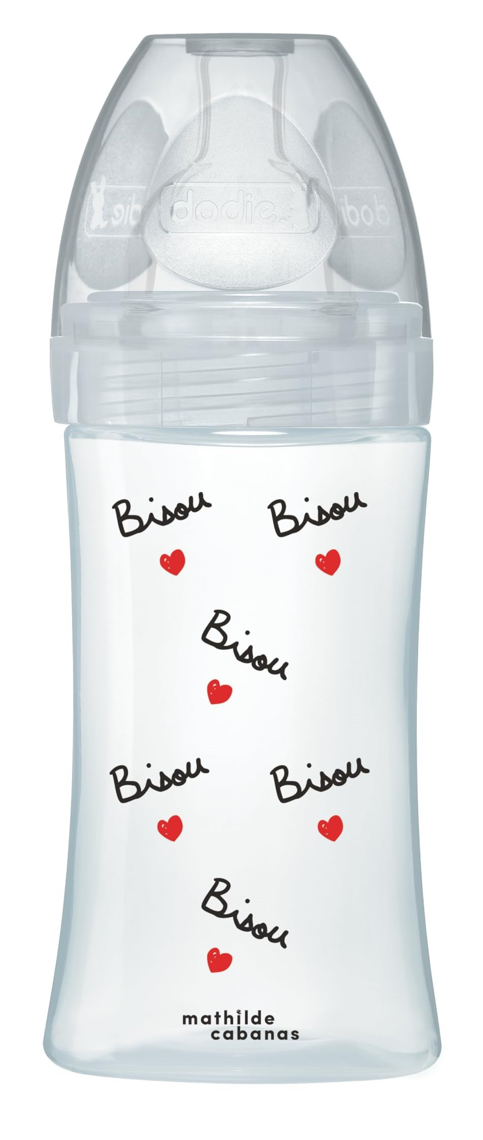 Ce biberon anti-colique est issu de la collection Mathilde Cabanas x Dodie. Ce biberon au motif bisous a été conçu pour les bébés de 0 à 6 mois. Il possède une tétine plate en silicone de débit 2 qui imite la forme aplatie du sein de la maman pendant la tétée pour faciliter la transition du sein au biberon.