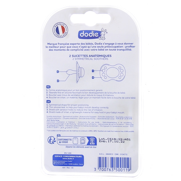 Téterelles des Sucettes Anatomiques 0-6 mois Message Dodie fabriquées à partir de silicone naturel. Sucettes exemptes de Bisphénol A.
