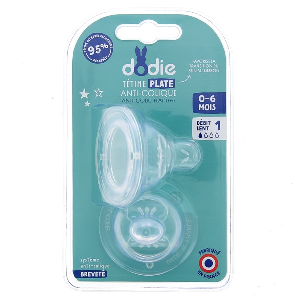 La Tétine plate anti-colique débit 1 (lent) de la marque Dodie reproduit la forme aplatie du sein de la maman pendant la tétée pour faciliter le passage du sein au biberon. Totalement sécurisée, elle répond efficacement aux besoins de confort des bébés.