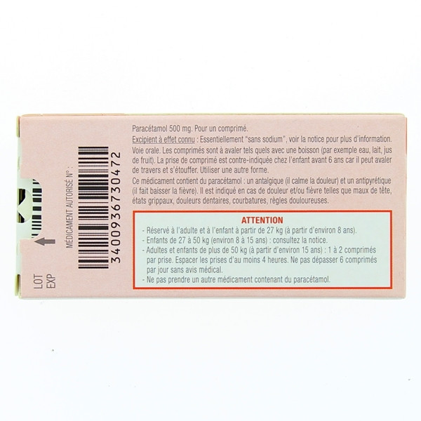 Les comprimés et les gélules à 500 mg sont destinés à l'adulte et à l'enfant de plus 6 ans et de plus de 27 kg.