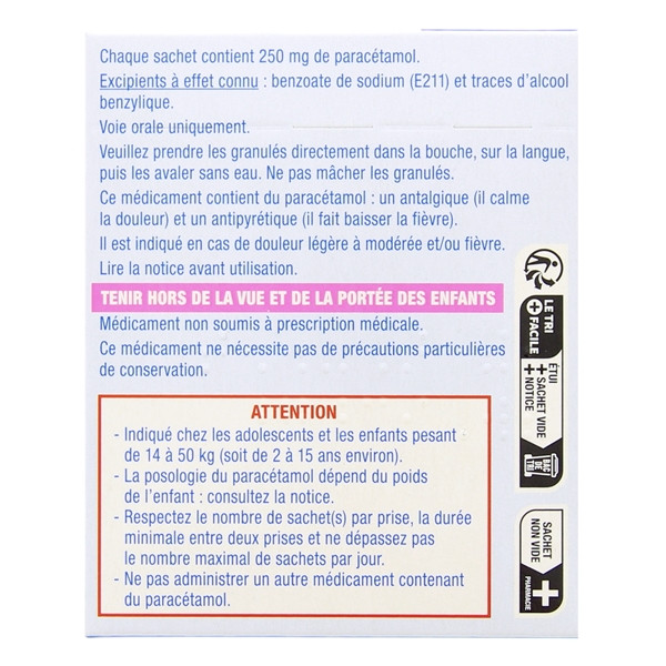 Les sachets à 250 mg sont réservés à l'enfant pesant plus de 14 kg.