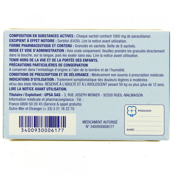 - Adulte et enfant pesant plus de 50 kg : 5000 mg à 1000 mg (soit 1 comprimé à 1000 mg ou 1 sachet à 1000 mg ou 1 à 2 comprimés à 500 mg ou 1 à 2 sachets à 500 mg) par prise, à renouveler si besoin, sans dépasser 3 comprimés à 1000 mg ou 3 sachets à 1000 mg ou 6 comprimés à 500 mg ou 6 sachets à 500 mg par jour.