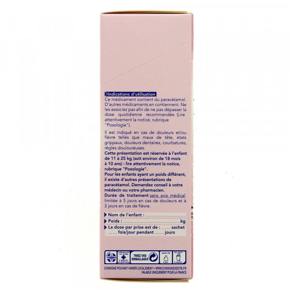 - Enfant de 25 à 30 kg (environ 8 à 11 ans) : 1 sachet à 300 mg, à renouveler si besoin au bout de 4 heures, sans dépasser 6 sachets par jour.