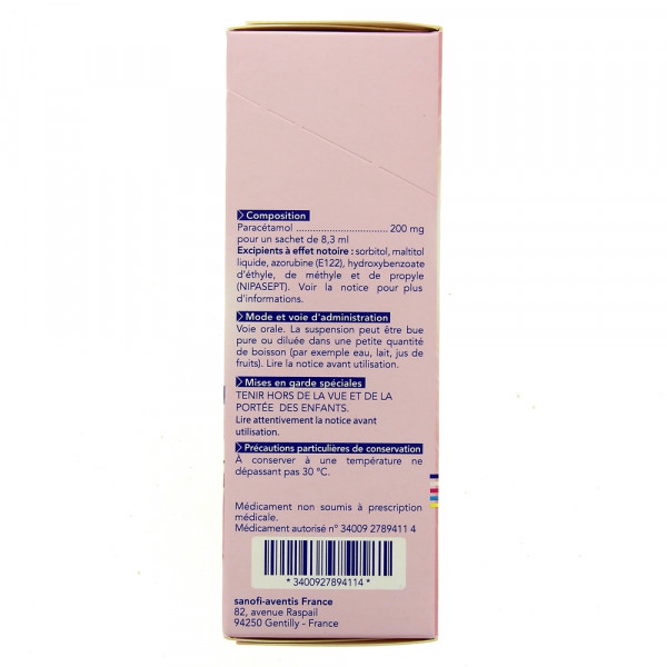 Sachet à 200 mg :- Enfant de 11 à 16 kg (environ 18 mois à 5 ans) : 1 sachet à 200 mg, à renouveler si besoin au bout de 6 heures, sans dépasser 4 sachets par jour.