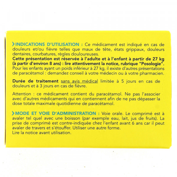 - Adulte et enfant de plus de 15 ans (pesant plus de 50 kg) : 1 comprimé, 1 à 3 fois par jour. Ne pas prendre 2 comprimés à 1 000 mg en même temps et ne pas dépasser 3 g de paracétamol par jour sans avis médical.