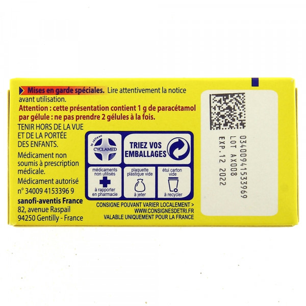 Boîte de 1g de paracétamol contenant 8 gélules de Doliprane.