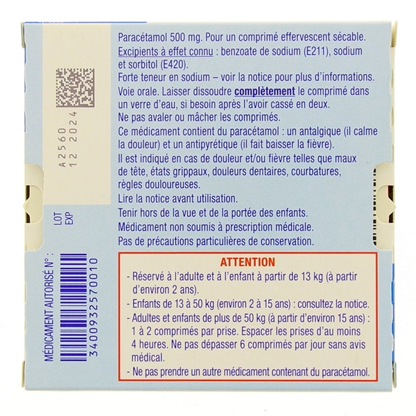 - Enfant de 41 à 50 kg (environ de 12 à 15 ans) : 2 comprimés dispersibles à 250 mg ou 1 comprimé à 500 mg (effervescent ou non), 1 à 6 fois par jour.