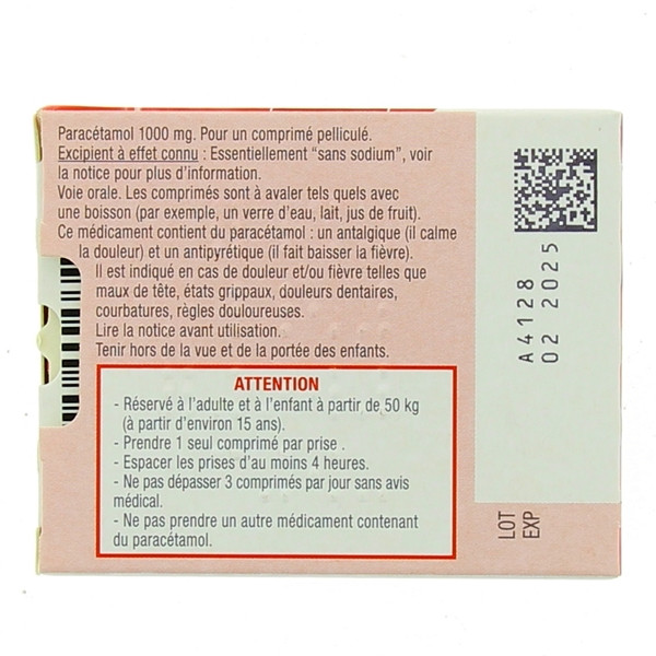 - Adulte et enfant de plus de 15 ans (pesant plus de 50 kg) : 1 comprimé, 1 à 3 fois par jour. Ne pas prendre 2 comprimés à 1 000 mg en même temps et ne pas dépasser 3 g de paracétamol par jour sans avis médical.