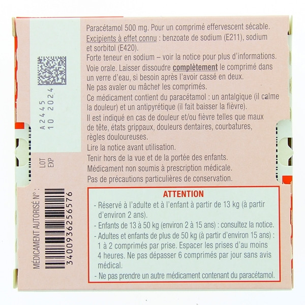 Les comprimés effervescents sécables à 500 mg sont destinés à l'adulte et à l'enfant de plus de 13 kg.