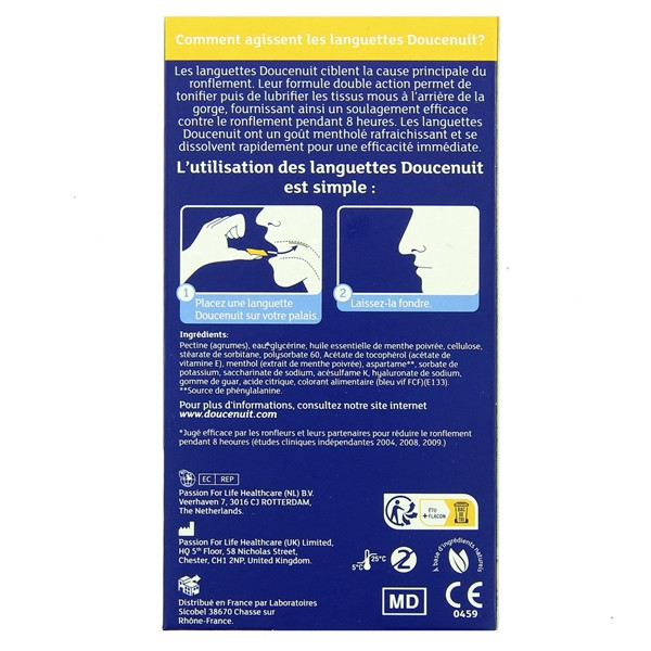 Les languettes Doucenuit Anti-ronflement résolvent efficacement les problèmes liés aux ronflements intempestifs de la gorge. Elles tonifient et lubrifient les tissus mous à l'arrière de la gorge pour soulager les ronflements.