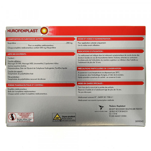 Emplâtres médicamenteux à base d'ibuprofène dosés à 200mg. NurofenPlast est disponible en boîte de 4 emplâtres.