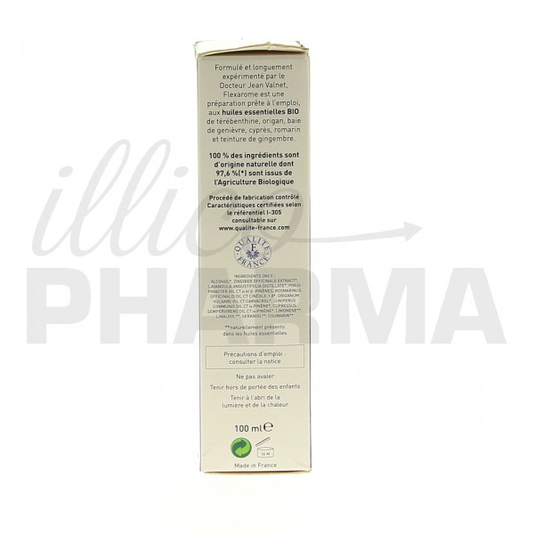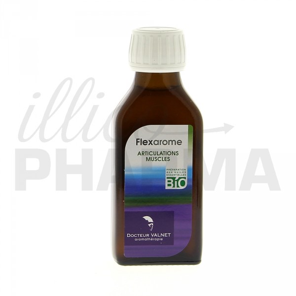 Formulée à base d'huiles essentielles Bio de romarin, térébenthine, origan, cyprès, baie de genièvre et teinture de gingembre, Flexarome est une préparation prête à l'emploi élaborée par la marque Docteur Valnet.