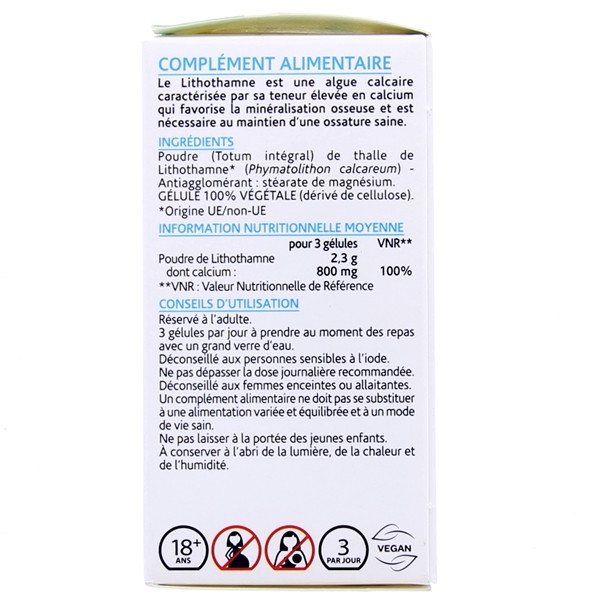 Poudre (Totum intégral) de thalle de Lithothamne* (Phymatolithon calcareum), Antiagglomérant : stéarate de magnésium, Gélule 100 % Végétale (dérivé de cellulose).