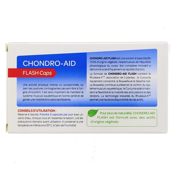 Chondro-Aid Flash Caps est une solution à base d’actifs 100% d’origine végétale, respectueuse de l’équilibre physiologique du corps. Son complexe innovant a démontré scientifiquement sa rapidité d’action.