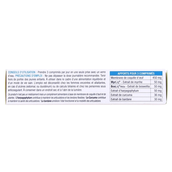 Ne pas dépasser la dose journalière recommandée. Tenir hors de portée des jeunes enfants. À utiliser dans le cadre d'une alimentation équilibrée et d'un mode de vie sain. L'emploi est déconseillé chez les femmes enceintes et allaitantes, en cas d'ulcères (estomac ou duodénum) ou de calculs biliaires et chez les personnes sous anticoagulant. À conserver dans un endroit sec et à l'abri de la lumière. Ce produit n’est pas un médicament mais un complément alimentaire à base de membrane de coquille d'oeuf et de plantes.