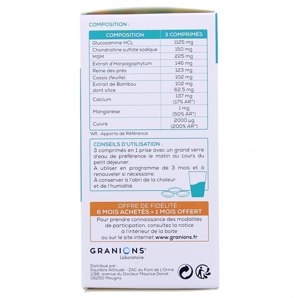 Glucosamine HCL ; Minéraux : Carbonate de calcium (Amidon de maïs), Phosphate tricalcique, Gluconate de cuivre, Gluconate de manganèse ; Méthylsulfonylméthane (MSM) ; Chondroïtine sulfate sodique ; Extrait d'harpagophytum (Harpagophytum procumbens, Maltodextrine) ; Reine des prés ; Cassis ; Extrait de bambou ; Antiagglomérant : Stéarate de magnésium ; Émulsifiants : Mono, Di et Tri-glycérides d'acides gras.