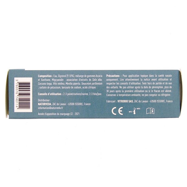 Eau, Glycérol (9,10%), Mélange de gommes Acacia et Xanthane, Migcyanidin : association d'extraits de Salix alba, Curcuma longa, Vitis vinifera, Mentha piperita, Tanacetum parthenium ; Sorbate de potassium, Benzoate de sodium, Acide citrique.
