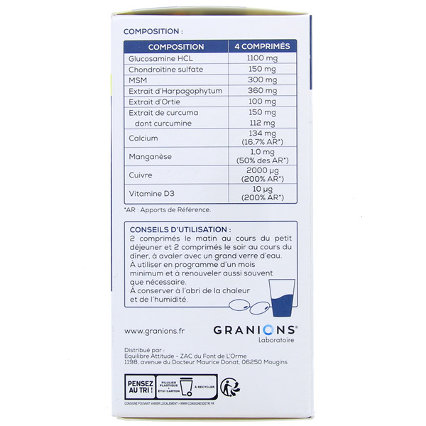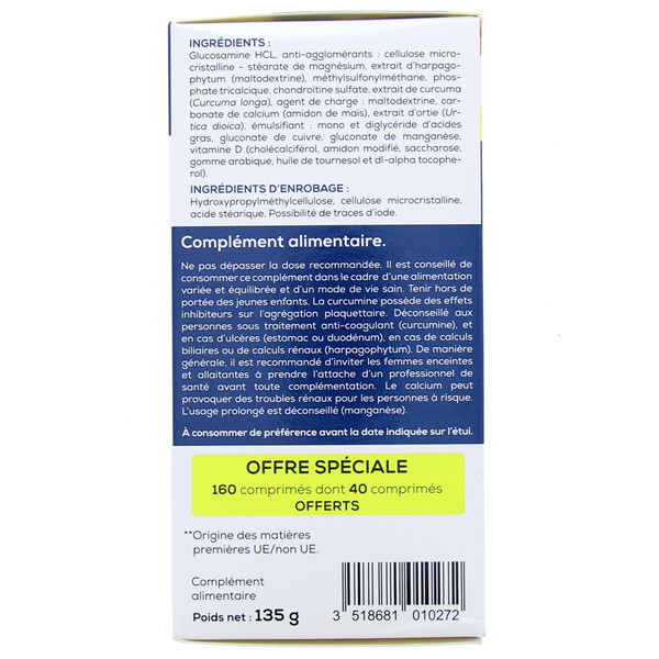 Glucosamine HCL (Crustacés), Antiagglomérants : Cellulose Microcristalline, Stéarate de Magnésium, Extrait d'Arpagophytum, Méthylsulfonyl-Méthane, Phosphate Tricalcique, Chondroïtine Sulfate, Agent de Charge : Maltodextrine, Extrait d'Ortie, Carbonate de Calcium (Amidon de Maïs), Émulsifiant : Mono et Diglycéride d'Acides Gras, Complexe de Curcumine (Gammacyclodextrine, Extrait de Curcuma), Gluconate de Manganèse, Gluconate de Cuivre, Vitamine D3 (Amidons Modifiés, Sucre, Triglycérides à Chaîne Moyenne, Tocopherols Naturels).
